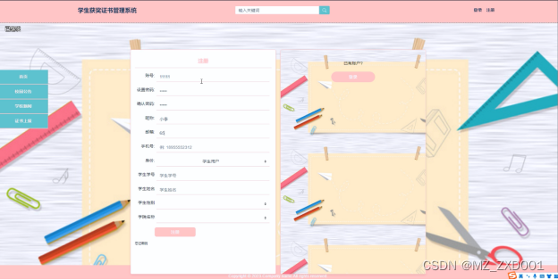 学生获奖证书管理系统的学生可以进行注册登录,当用户左上角“注册”按钮的时候,当填写上自己的账号+密码+确认密码+昵称+邮箱+手机号,选择身份,然后填写身份信息后再点击“注册”按钮后将会先验证输入的有没有空数据,再次验证密码和确认密码是否是一样的,最后验证输入的账户名和数据库表中已经注册的账户名是否重复,只有都验证没问题后即可注册成功。其用注册界面展示如下图4-2所示。