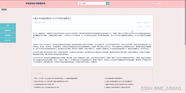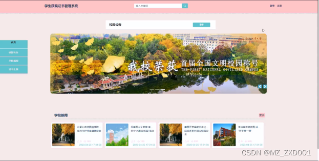 (2)查看学生获奖证书管理系统的首页信息:学生获奖证书管理系统的首页信息包含了首页、校园公告、学校新闻、证书上报。