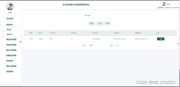 基于Spring Boot技术的美术馆售票管理系统中的管理人员是可以对注册的用户进行管理的,也可以对管理员进行管控。界面如下图所示。