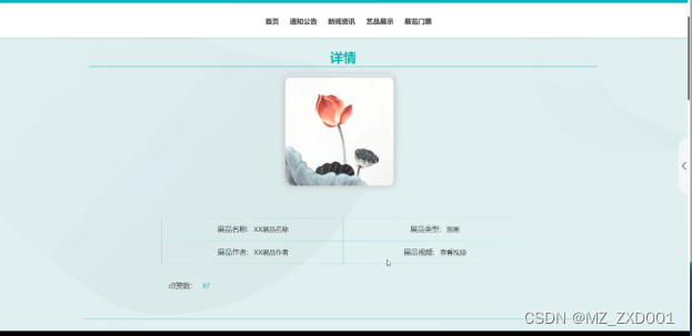 当用户点击“艺品展示”按钮后会进入该艺品展示的详情界面,可以了解到艺品的作者及介绍等信息,同时可以进行点赞、收藏、评论等操作,艺品展示详情页面如下图所示。