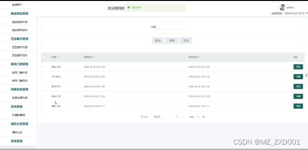 管理员点击“艺品展示管理”会显示出艺品展示列表和艺品展示添加这两个子菜单,支持通过关键词进行查询,如果想要添加新的艺品展示,点击“艺品展示添加”按钮,输入相关信息,点击“提交”按钮就可以添加了,同时可以选择某一条艺品展示,点击“删除”进行删除。界面如下图所示。