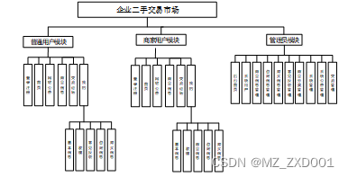 按照企业二手交易市场的角色,系统划分为了普通用户模块、商家用户模块和管理员模块这两大部分。