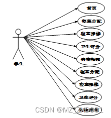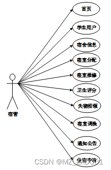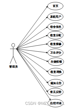 为了满足当前玉林师范学生宿舍管理的各方需求,我们建立了一个数字化+信息化的玉林师范学院宿舍管理系统。与管理员相对比,学生的操作显然更为简单,因此我们使用了一个用例图来说明系统的各个权限。