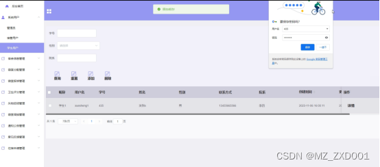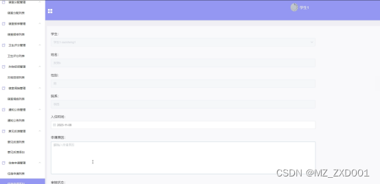 当学生登录系统时,系统会通过SESSION来检测是否有学生登录,如果没有,就会提醒学生登录账户。然后,系统会将学生输入的信息存储在数据库表中,并通过sql进行查询。管理员在系统后台管理学生的住宿申请。