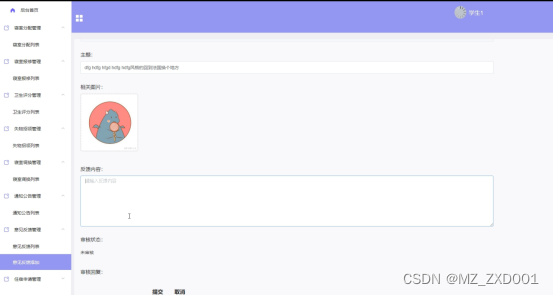 学生点击一下意见反馈就会进入到意见反馈详细页,填写意见反馈信息,提交意见反馈信息,成功意见反馈后,管理员可以管理学生的意见反馈信息,审核意见反馈信息并回复。
