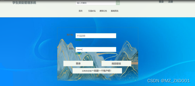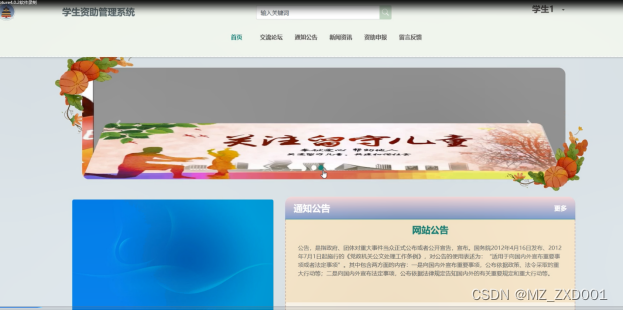 (2)查看学生资助管理系统的首页信息:学生资助管理系统的首页信息包含了首页、交流论坛、通知公告、新闻资讯、资助申报、留言反馈等。