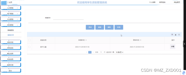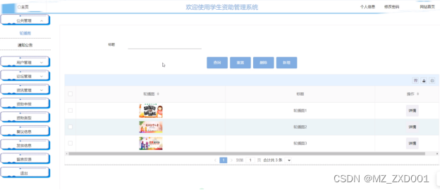 The system mainly includes functional modules such as public management (carousel images, notification announcements), user management (administrators, students), forum management (exchange forums, forum classification), information management (news information, news classification), funding application, funding type, review information, distribution information, message feedback, exit, etc. By using the SSM framework, front-end and back-end interaction, data persistence, and business logic processing have been achieved, ensuring the stability and scalability of the system.