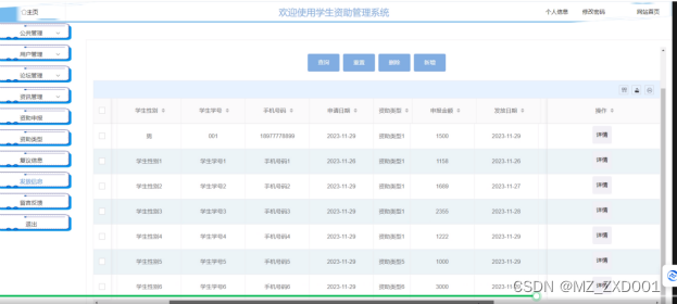 该系统主要包括功能模块有:公共管理(轮播图、通知公告)、用户管理(管理员、学生)、论坛管理(交流论坛、论坛分类)、资讯管理(新闻资讯、新闻分类)、资助申报、资助类型、复议信息、发放信息、留言反馈、退出等。通过使用SSM框架,实现了前后端交互、数据持久化和业务逻辑处理,保证了系统的稳定性和可扩展性。
