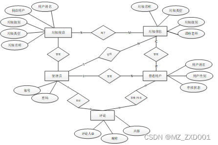 数据库概念结构设计主要涉及数据库的实体和实体之间的关系。通过实体-关系模型或者其他适当的模型,我们将定义系统中涉及的各个实体以及它们之间的联系。垃圾分类系统利用E-R图对上述实体和联系进行描述。