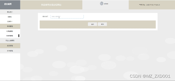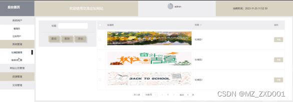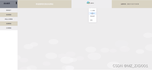 This forum website has two roles: administrator and registered user. The administrator functions include backend homepage, system user management, system management (carousel image management, sensitive word management), website management, news information management, information classification management, forum classification management, communication forum management, etc. The user functions include personal center, communication forum management, my favorites management, system management, etc. Ordinary administrators have a homepage, communication forum, website announcements, news and information, my account, personal center (personal homepage, communication forum, favorites), etc. Therefore, it has certain practicality.