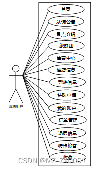 旅游管理系统主要包括系统用户和管理员两个角色。系统用户可以浏览最新的旅游信息和推广活动,查看详细的景点介绍、旅游团行程安排,预订景点门票和酒店房间,选择合适的导游,并提交特殊申请。用户还可以管理个人账户,查看订单记录和收藏内容。管理员负责管理系统用户信息,发布系统公告,管理景点介绍、旅游团、售票中心、酒店信息、导游信息等内容,处理退房申请,并管理特殊旅客需求。管理员还可以管理轮播图和系统公告。通过这些功能,旅游管理系统实现了方便快捷的旅游产品预订和管理,提供了个性化的服务,为用户提供愉快的旅游体验。同时,管理员能够高效管理系统内容和运营,确保系统正常运行并向用户传达重要信息。具体功能分析如下: