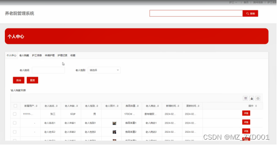 (4)老人档案:当管理员点击“老人档案”这一菜单时,可通过局部搜索查询浏览老人档案信息详情。同时可对老人档案进行增删改查。