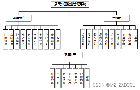 系统功能模块包括管理员模块和家属用户模块和护工用户模块,登录进去对应相应的功能,具体的功能模块图如图3.1所示。