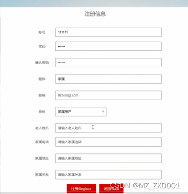 (1)注册登录:家属用户通过注册登录系统,可通过点击头像中我的账户,对个人信息进行增删改查。比如个人资料、头像和密码修改。