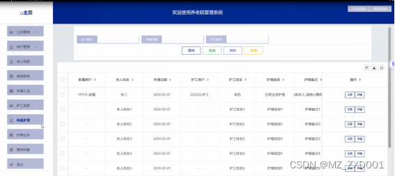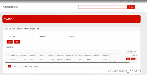 申请护理:当管理员点击“申请护理”时,可对申请请求进行审核通。同时可对申请记录进行增删改查。界面图如下。