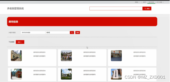 房间信息:家属用户可局部搜索进行浏览养老院房间信息详情,可对房间信息进行点赞、收藏和评论或选择入住选择。界面图如下。
