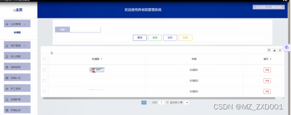 (2)公共管理:当管理员点击“公共管理”这一菜单时,可查看轮播图; 如需添加新的轮播图,点击右侧“新增”按钮,上传图片,输入标题,点击“确认”按钮进行添加;