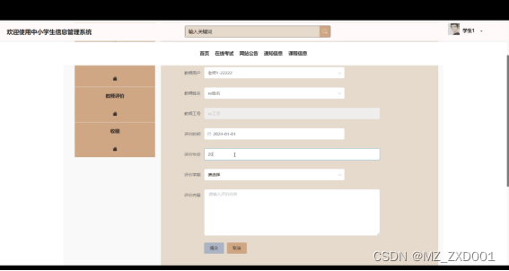 教师评价:学生可以对教师进行评价,包括教师姓名、工号、评价时间、年份、学期、评价内容等信息。提供对教学质量、教师态度等方面的反馈,有助于学校改进教学质量和建立良好的教学环境。界面如下图所示。
