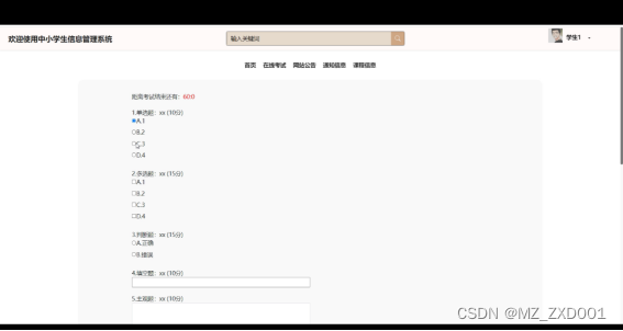 - 在线考试:学生可以参加在线考试,系统提供试题库,学生可以选择相应科目的试题进行答题,并能查看考试成绩和错题记录,有助于学生评估自己的学习水平和知识掌握情况。