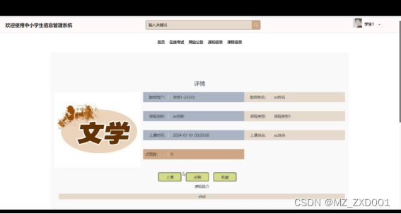 课程信息:学生可以查看自己所选修的课程信息,包括教师姓名、课程名称、课程类型、上课时间、上课地点、课程简介等信息,方便学生掌握自己的学习计划和课程安排,可以进行上课、点赞、收藏、评价等操作。界面如下图所示。