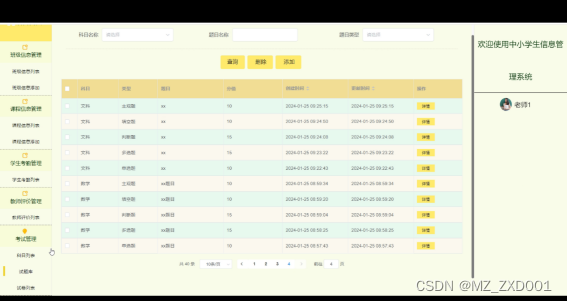 考试管理:教师可以管理考试相关的功能,包括科目列表的维护、试题库的管理、错题记录的查看和试卷列表的生成与发布等,方便教师进行考试安排和学生参加考试。界面如下图所示。