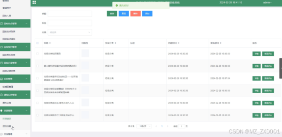 - 资源管理:当点击“资源管理”这一菜单时,可查看环保资讯列表和资讯分类添加这两个子菜单。如需添加新的环保资讯,点击“环保资讯添加”按钮,输入资讯标题、插入封面图,点击“提交”按钮进行添加。同时管理员可以对这两个模块进行增删改查操作。