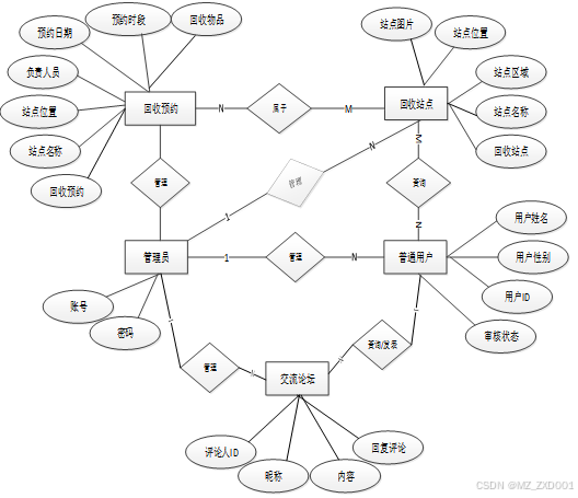 下面是整个城镇居民社区再生资源回收系统中主要的数据库表总E-R实体关系图。
