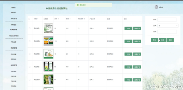 (7)商城管理:管理员可以对农资商城、分类列表、订单列表、订单配送进行管理,可以对农资产品信息、分类信息、订单信息和订单配送进行添加、查询、重置、删除和审核配送操作。