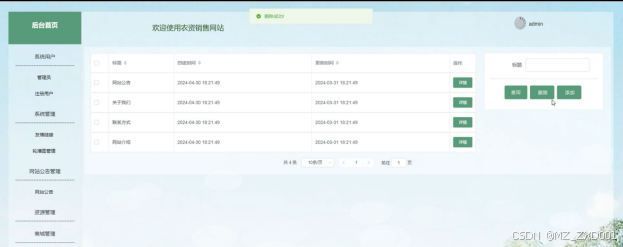 (5)网站公告管理:管理员可以对网站公告进行添加、查询、重置、删除操作。