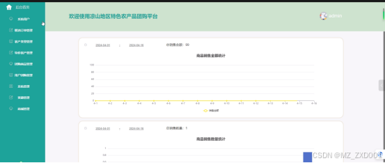 - 后台首页:管理员可以查看后台首页展示商品销售金额统计和商品销售数量统计信息。