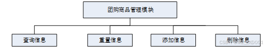 团购商品管理模块是本系统中的重要功能之一。该模块的设计旨在提供对团购商品的发布、编辑、删除和查看等管理功能,以便及时、准确地向系统用户发布相关的团购商品信息。其模块功能结构图如下3-3所示:
