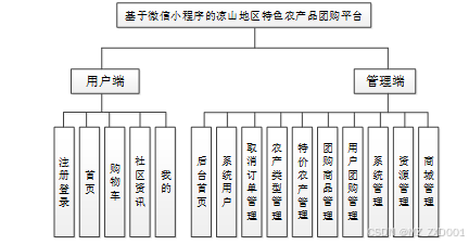 按照基于微信小程序的凉山地区特色农产品团购平台的功能模块,主要包括用户端(普通用户)和管理端(管理员)这两大功能模块。