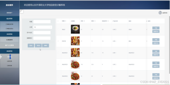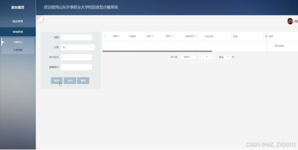 在“点餐中心”界面点击“添加”输入标题、封面图、描述、原价、卖价、商品库存、分类等信息,可以进行查询、重置或删除等操作。其界面如下图5-15所示。