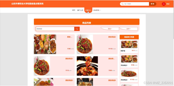 点餐中心:当用户点击首页导航栏的“点餐中心”钮将页面可查看店家发布的商品列表信息,支持通过关键词进行搜索,或通过筛选工具筛选自己想要查看的商品信息,进入到商品信息的展示界面,在展示界面可以查看美食的图片、价格、详情、评论等信息,同时可以进行点赞、加入购物车、发表评论、完成在线购买支付等操作,点餐中心如图5-5示。