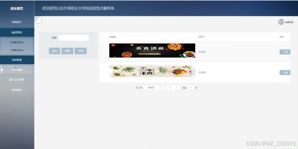 管理员在“系统管理”界面可以对轮播图进行查看和管理,在轮播图界面点击“添加”按钮进入添加页面、填写标题、上传图片即可完成轮播图的添加,还可以对轮播图进行查询、重置、删除操作。系统管理界面如下图5-10所示。