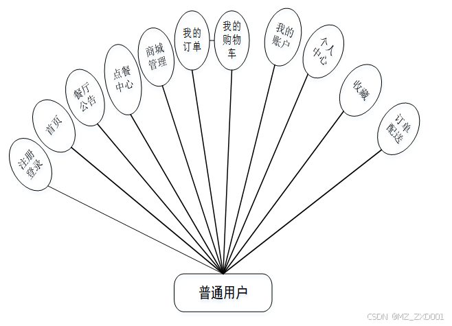 (3)普通用户,主要功能有:首页、餐厅公告、点餐中心、商城管理(我的购物车、我的订单)、我的账户、个人中心等功能。普通用户用例图如图3-3所示。