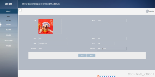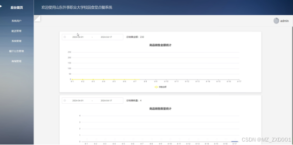 管理员登录进入山东外事大学校园食堂点餐系统后台会展示商品销售金额统计图和商品销售数量统计图,可以查看、修改个人基本信息和密码、管理员管理:系统管理、系统用户、配送管理、餐厅公告管理、商城管理等功能信息并可进行相应操作,如图5-9所示。