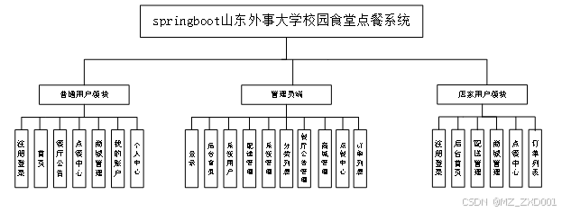 本山东外事大学校园食堂点餐系统主要包括三大功能模块,即普通用户模块、管理员功能模块和店家用户模块。