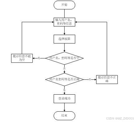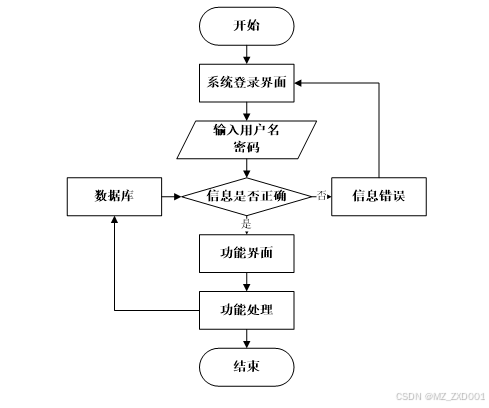 用户打开并进入系统后,会先显示登录界面,输入正确的用户名和密码,系统自动检测信息,若信息无误,则用户会进入系统功能界面,进行操作,否则会提示错误无法登录,操作流程如图3-3所示。