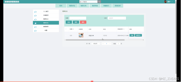 (3)租房公告:当用户点击“租房公告”这一菜单按钮,会显示管理员在后台发布的所有的租房公告,可以查看详情;