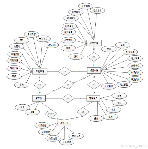 下面是整个高校科研成果管理系统中主要的数据库表总E-R实体关系图。