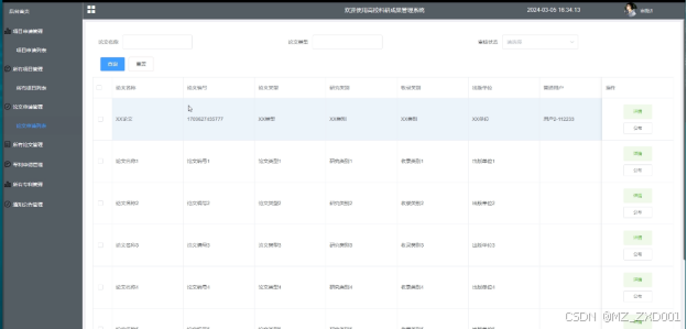 - 所有论文管理:可查看所有论文信息,进行查询操作,支持论文名称、论文类型搜索,点击可查看详情。