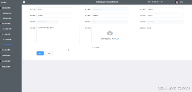 可查看提交的论文申请信息,进行增改删查操作,支持论文名称、论文类型、审核状态搜索,添加提交项目申请信息(论文名称、论文类型、研究类别、收录类别、出版单位、论文详情、论文文档)等待审核,可点击查看详情。其界面如下图所示: