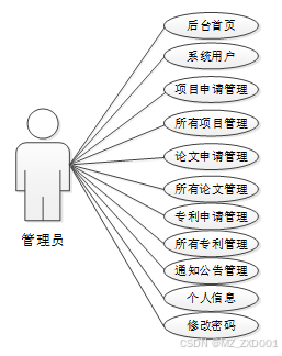 通过2.3功能的分析,得出了本高校科研成果管理系统的用例图:
