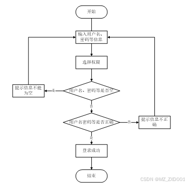 用户打开并进入系统后,会先显示登录界面,输入正确的用户名和密码,系统自动检测信息,若信息无误,则用户会进入系统功能界面,进行操作,否则会提示错误无法登录,操作流程如图2-3所示。