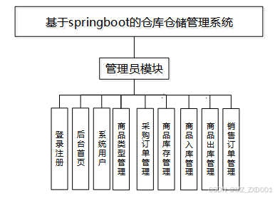 在上一章节中主要对系统的功能性需求和非功能性需求进行分析,并且根据需求分析了本系统中的用例。那么接下来就要开始对本系统的架构、主要功能和数据库开始进行设计。基于springboot的仓库仓储管理系统根据前面章节的需求分析得出,其总体设计模块图如图3-2所示。