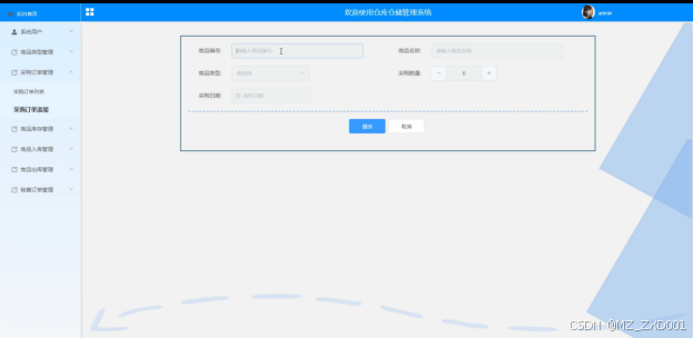 In terms of functional design, the system covers multiple core modules, including the backend homepage, system user management, product type management, purchase order management, product inventory management, product inbound management, product outbound management, and sales order management. Through these modules, administrators can easily define and maintain product types, create and track purchase orders, query and adjust product inventory, perform inbound and outbound operations on products, and process and analyze sales orders.