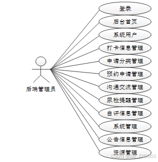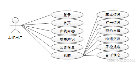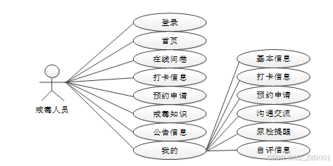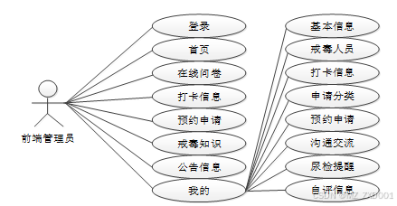 社区戒毒人员心理健康微信小程序的完整UML用例图分别是图3-1、3-2、3-3、3-4、3-5。前端戒毒人员角色用例如图3-1所示。
