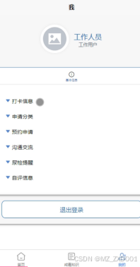 在“我的”界面中,社区工作用户可以便捷地管理基本信息板块展示了工作用户的个人资料,便于随时查看和更新。打卡信息记录了每天的戒毒人员情况,包括是否按时参与活动、完成康复任务等。工作用户审核戒毒人员的预约申请。沟通交流板块提供了一个安全的在线交流平台,尿检提醒功能则通过定时通知,确保戒毒人员按时进行尿检,监测身体状况。自评信息部分允许戒毒人员自我评估康复进展。工作用户我的界面如下图5-9所示: