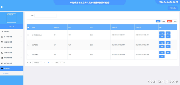 - 资源管理:通过在线问卷,工作用户能够深入了解戒毒人员的心理状态、需求变化,为制定个性化的戒毒康复方案提供科学依据。同时,工作用户可以添加、删除、查询、重置、评分问卷。